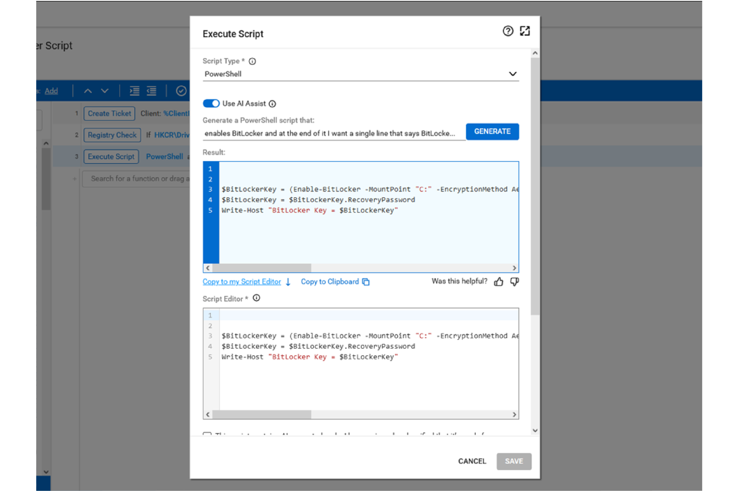 Let AI do the heavy lifting for PowerShell, batch, and bash scripts. Your team must review all scripts before running, so you’re always in the know.
