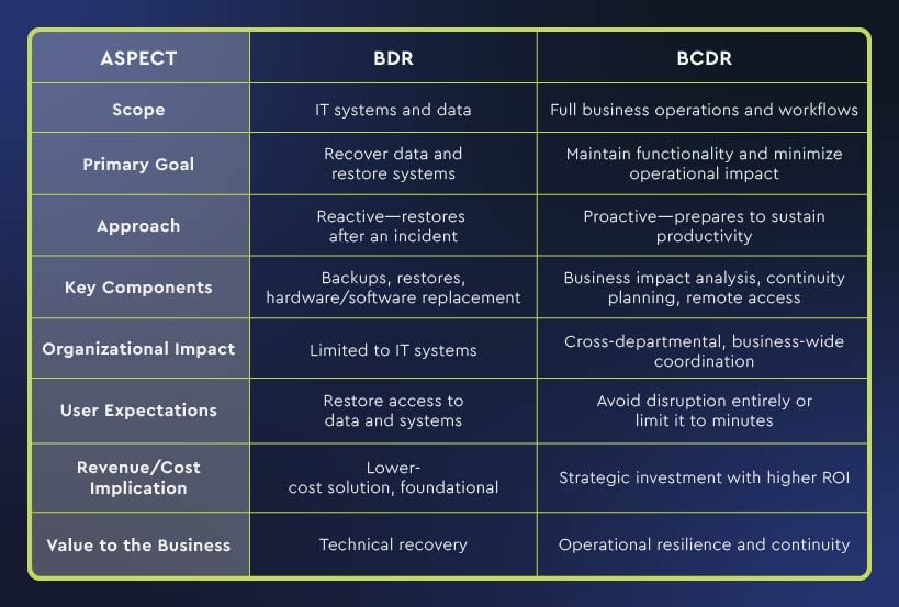 • BDR is focused on restoring data and systems, while BCDR expands to keep the entire business running during a crisis