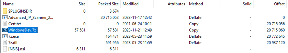 The incidents began with users downloading the file advanced_ip_scanner_2.5.4594.1.exe from advenced-ip-scanner[.]com. This file is an NSIS installer containing a legitimate installer, a copy of 7zip along with a 7zip archive, and an empty file called Cert.txt that acts as a mutex for the installer.