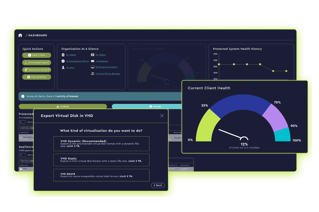 ConnectWise’s on-prem backup solutions manage large datasets and virtual machines through incremental backups, parallel processing, and real-time monitoring. This helps support data workflows, analytics pipelines, and infrastructure dependencies, contributing to better performance, reduced resource strain, and fast, reliable recovery. This even applies to complex or enterprise-scale environments.