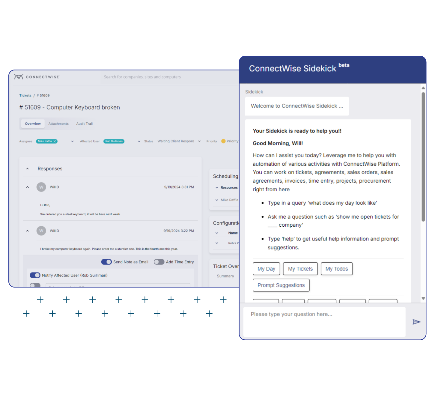 Streamline and simplify the way your MSP business handles tickets to improve customer satisfaction. Leverage powerful AI and machine learning to dramatically speed up triaging, processing, and ticket resolution. Access to PSA records and business insights via the ConnectWise Sidekick bot in Microsoft Teams makes it a valuable asset to every role within your organization.