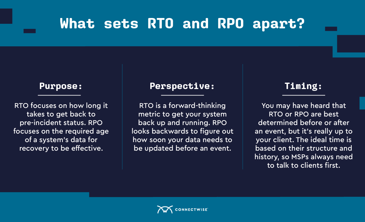 • Perspective. RTO looks forward in time, since the main focus of this metric is a fully-restored IT system. Consequently, RPO looks back in time and considers how soon before an event data needs to be updated.