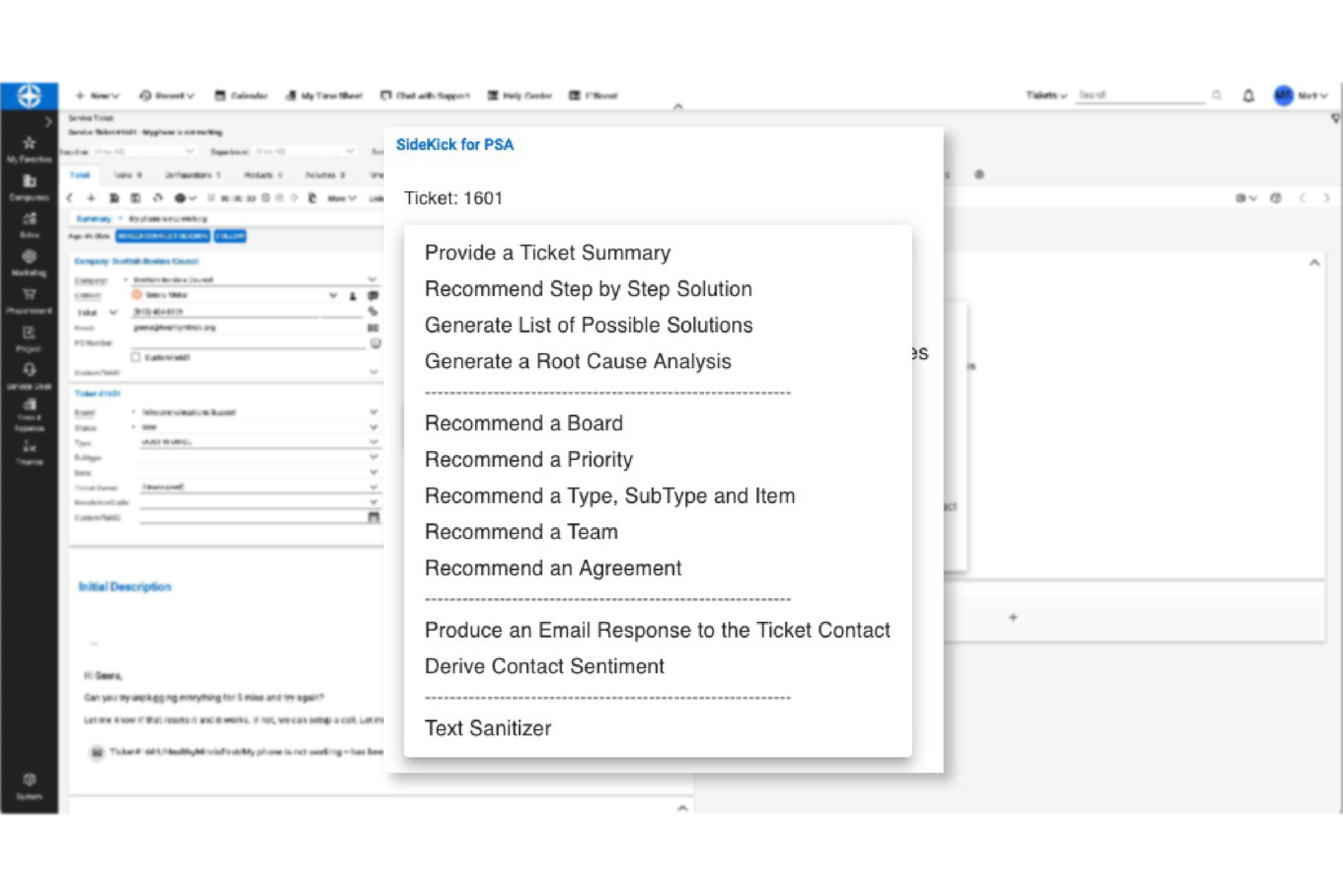 Sidekick for PSA suggests resolutions based on previous tickets.
