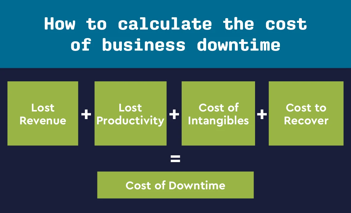 To calculate the final cost of downtime, use the formula: Cost of Downtime (per hour) = Lost Revenue + Lost Productivity + Cost to Recover + Cost of Intangibles.
