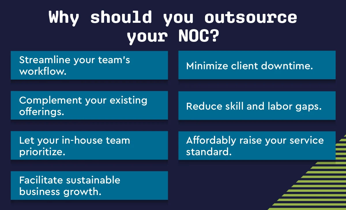 Partnering with a third-party NOC can help you manage and scale your MSP business by doing most of the technical work necessary to provide first-class IT services to your clients. There are many benefits to outsourcing your network operations center, like: