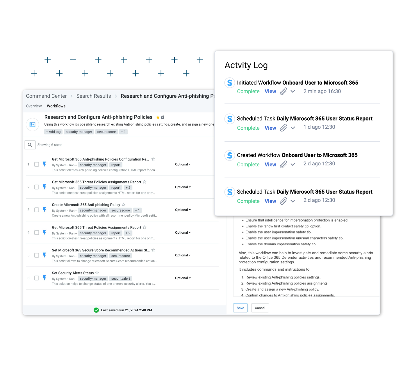 With the cloud automation feature, you can conquer the complexity of managing SaaS, IaaS, and PaaS to streamline your operations and ultimately provide exceptional customer support. You can perform any admin task for any customer, across cloud services from a single pane of glass. Say goodbye to endless browsers, credentials, and portals—with cloud automation it's click, click, done.